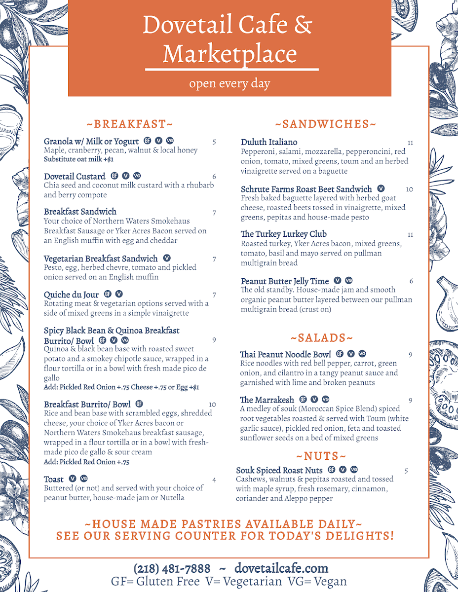 Welcome to Dovetail Cafe & Marketplace—a delightful oasis in Duluth, Minnesota. Nestled at 1917 W Superior St, this café offers a thoughtful menu that mixes comfort and creativity. Customers rave about the quiche, with options like the savory meat version that pairs beautifully with a zesty side salad. Breakfast favorites such as the Duluth traverse and Skyline highlight the café’s commitment to quality. The aromatic coffee is a standout, with baristas perfecting every cup, even creating stunning designs atop lattes.